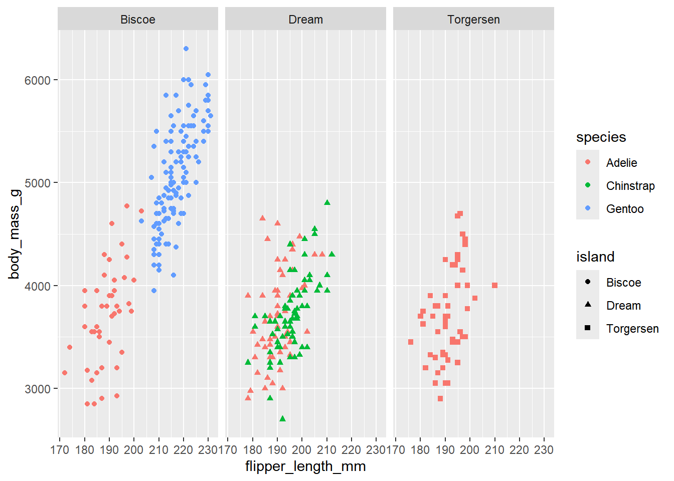 aes(x = flipper_length_mm, y = body_mass_g, color = species, shape = island)