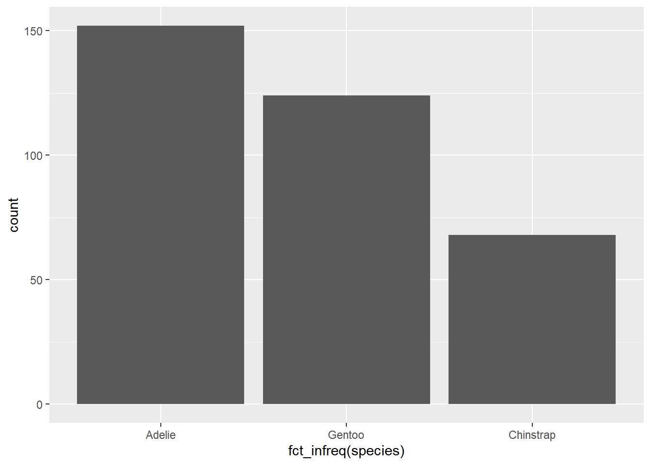 ggplot(penguins, aes(x = fct_infreq(species))) + # 按频率排序