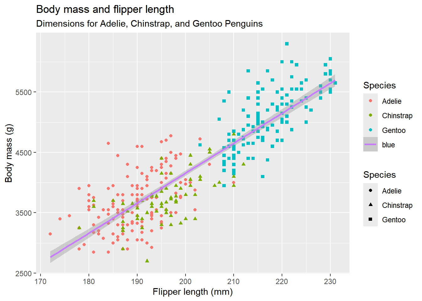mapping = aes(x = flipper_length_mm, y = body_mass_g, color = "blue")