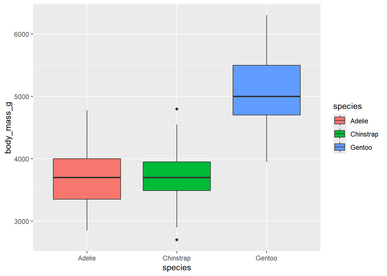 ggplot(penguins, aes(x = species, y = body_mass_g, fill = species)) +