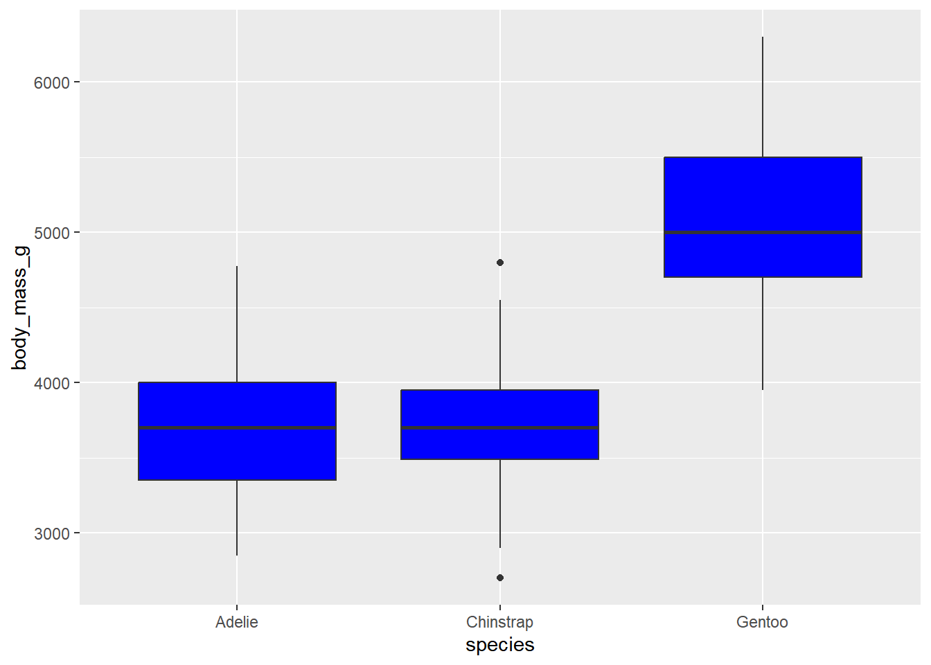 species变量映射到fill美学上,使得不同种类的企鹅在箱线图中显示为不同的填充颜色。如果我们希望该视觉属性保持不变,则不应将变量映射到该美学上。 例如,如果我们希望所有箱线图都显示为蓝色填充,则应将