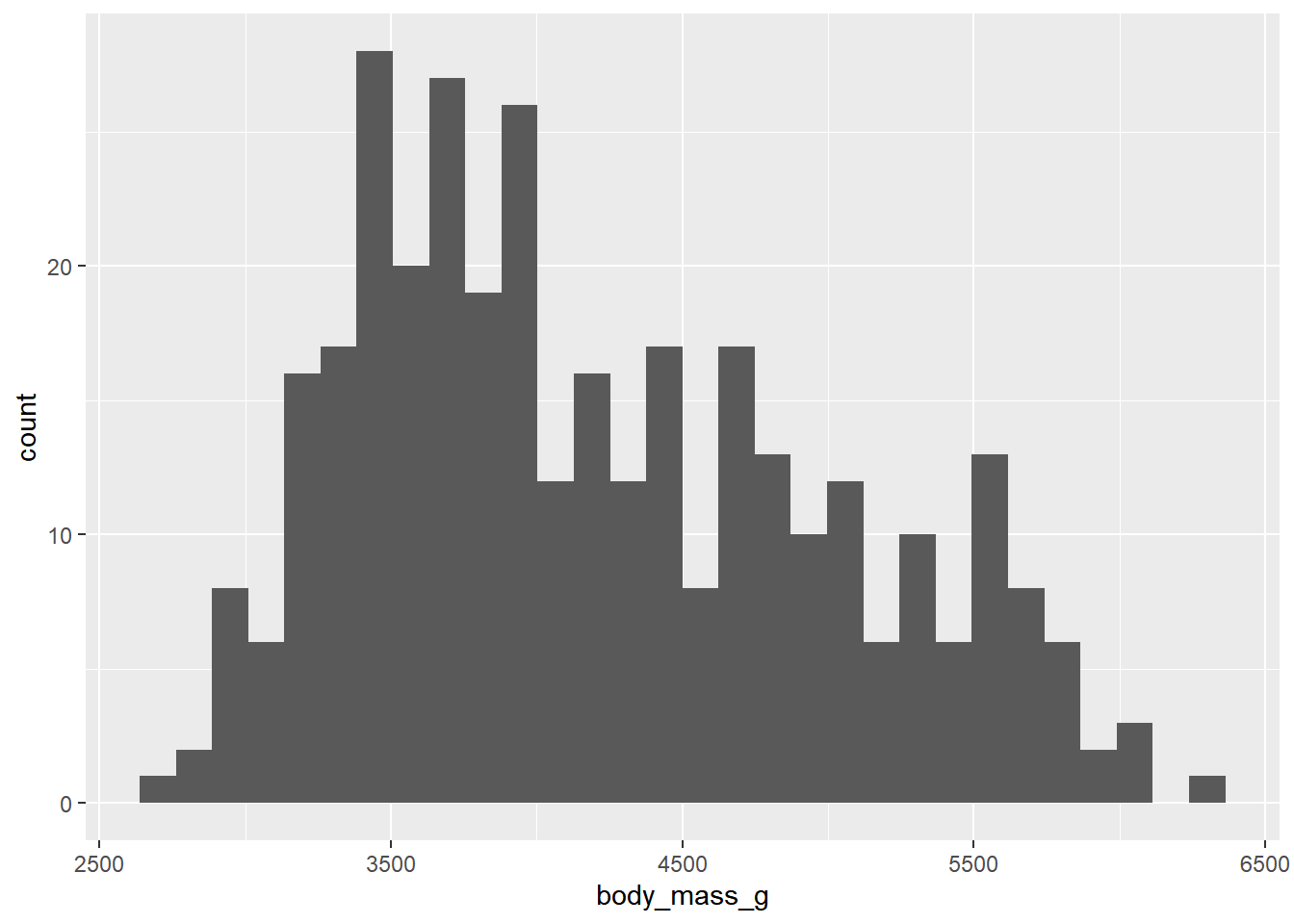- 下图中,我们使用直方图来展示企鹅体重的分布情况:最高的柱状显示有 39 个观测值的重量在 3,500 至 3,700 克之间,这是柱状图的左右边缘。