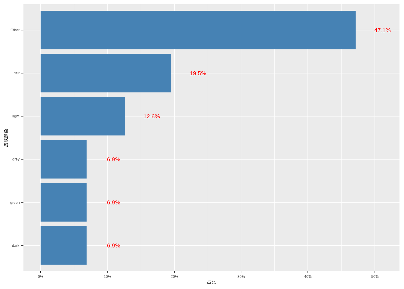 labs(x = "皮肤颜色", y = "占比") +