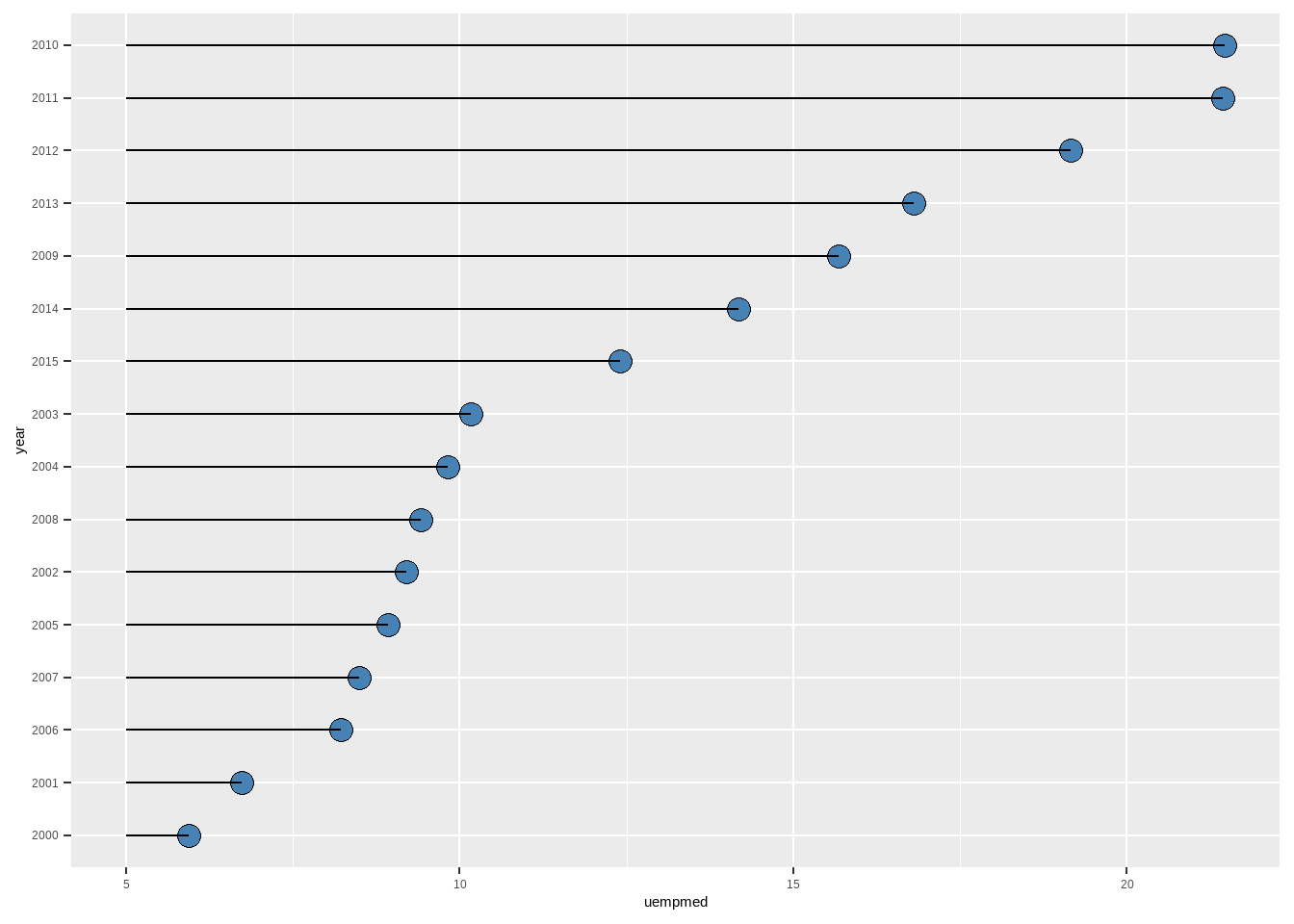 ggplot(aes(reorder(year, uempmed), uempmed)) +
