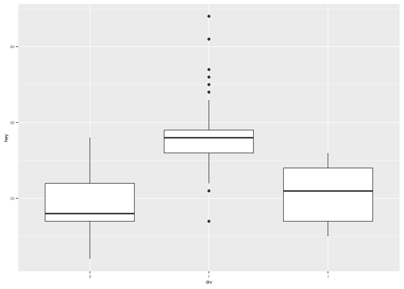 ggplot(mpg, aes(drv, hwy)) +