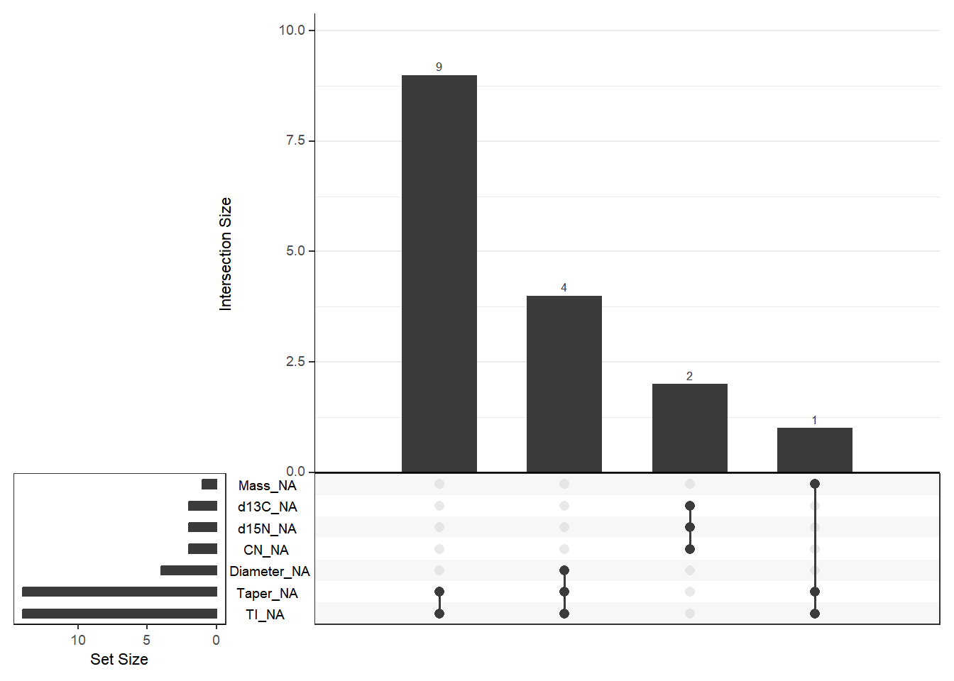 miss_cols <- c("Taper", "TI", "Diameter", "Mass", "d13C", "d15N", "CN")
